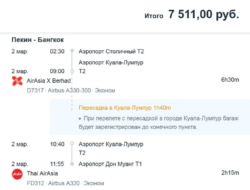 AirAsia. Азиатская лоукост-компания совершает перелеты через Куала-Лумпур. Летают самолеты ежедневно, по 7–8 раз. Самая низкая цена базового билета — 7500 ₽, при покупке за 2 недели. Но за провоз багажа в 20 кг и выбор места нужно доплачивать.