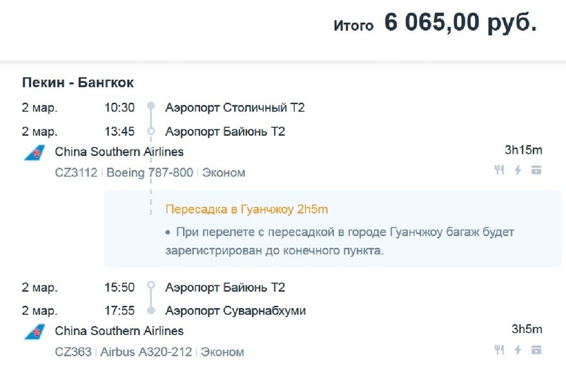 Тем, кто предпочитает летать с комфортом, с нормальным багажом, советую выбирать рейсы Air China или Thai Airways. Прямой рейс всегда удобнее, а еще мне нравится их багажная политика. Для людей экономных больше подходит транзитный полет China Southern Airlines. Сморите сами — удобное расписание, есть короткие стыковки (от 2 часов), в цену включен багаж, полет со стандартным сервисом (медиа, питание, розетки). А стоимость в 2 раза ниже, чем у прямого перелета.