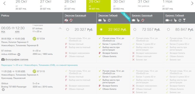 S7 Airlines. Расписание полетов у авиакомпании не такое гибкое, как у предыдущего оператора, потому что ежедневные рейсы выполняются с июня по конец октября, а в остальной период года — только по вторникам, пятницам и воскресеньям. Улететь по маршруту с перевозчиком получится только один раз в день — утром. Путешествие с полуторачасовой пересадкой в Новосибирске займет 11,5 часа.