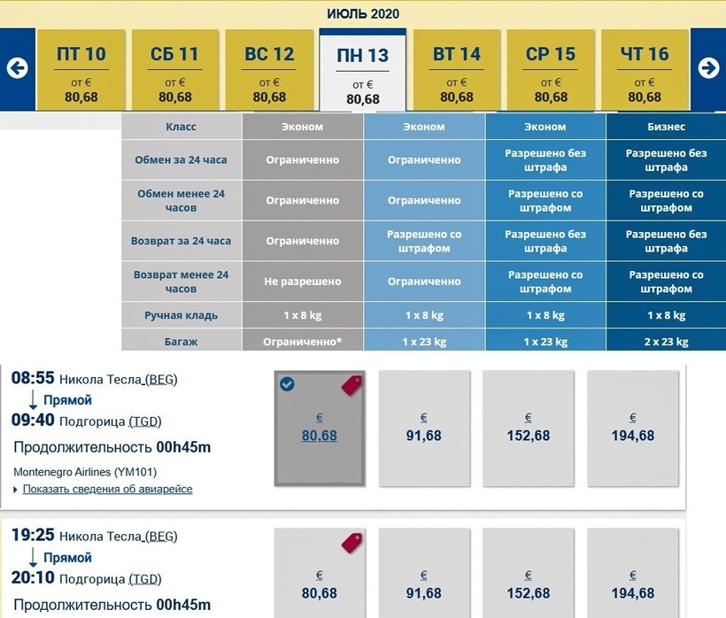 Самолеты Montenegro Airlines летают по маршруту каждый день утром и вечером. Авиабилеты у оператора могу отнести к недорогим: в одну сторону обойдутся с багажом от 7200 ₽ (92 €), туда-обратно стоят от 13500 ₽ (170 €). Бизнес-класс — от 15500 ₽ (195 €). Цены стабильны круглый год, поэтому не могу посоветовать бронировать билеты задолго до даты отправления. Хоть и незначительно, но, путешествуя с черногорским авиаоператором, можно сэкономить, если лететь только с ручной кладью — путешествие будет дешевле на 900 ₽.