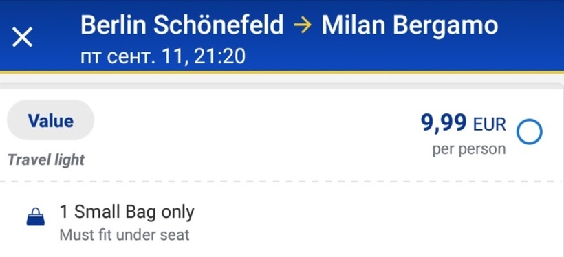 Ryanair. Бюджетная авиакомпания известна своими низкими ценами. Самолеты Ryanair вылетают из Шёнефельда и прилетают в Бергамо. В неделю есть только 5 рейсов. При бронировании за 1,5 месяца до вылета цена билета — от 10 € (850 ₽) с ручной кладью весом не больше 5 кг.