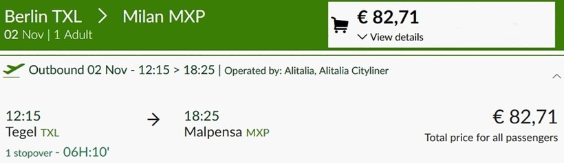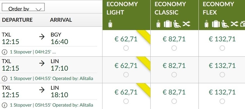 Alitalia. Итальянская авиакомпания с огромным количеством ежедневных рейсов со стыковкой в римском хабе Фьюмичино. Вылетают авиалайнеры компании и из Шёнефельда, и из аэропорта Тегель. И посадку самолеты Alitalia совершают во всех авиаузлах Милана. Обычная тарифная сетка для экономкласса:
