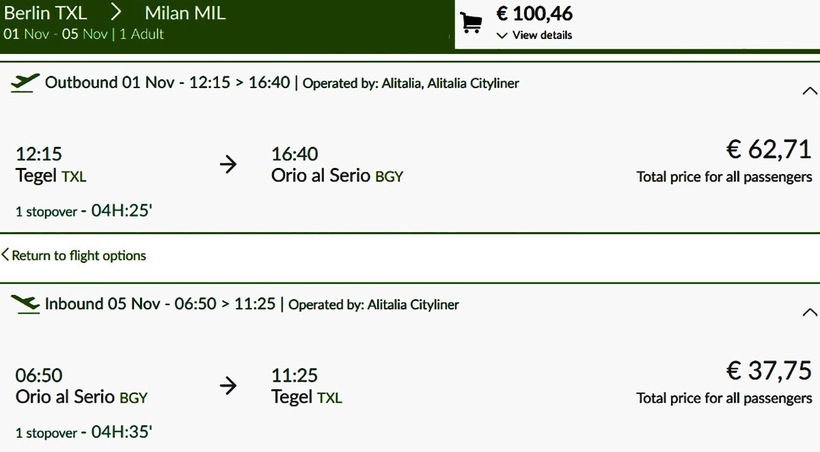 Easyjet (U2 5073) Airbus А320 | 11:00 Берлин (BER) | 1 ч. 40 мин | 12:40 Милан (LIN) | 19 октября |