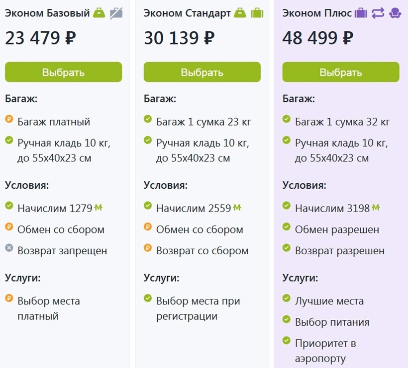 Эконом Стандарт — включает провоз и ручной клади, и багажа весом 23 кг, разрешено менять или возвращать билет (со сбором);