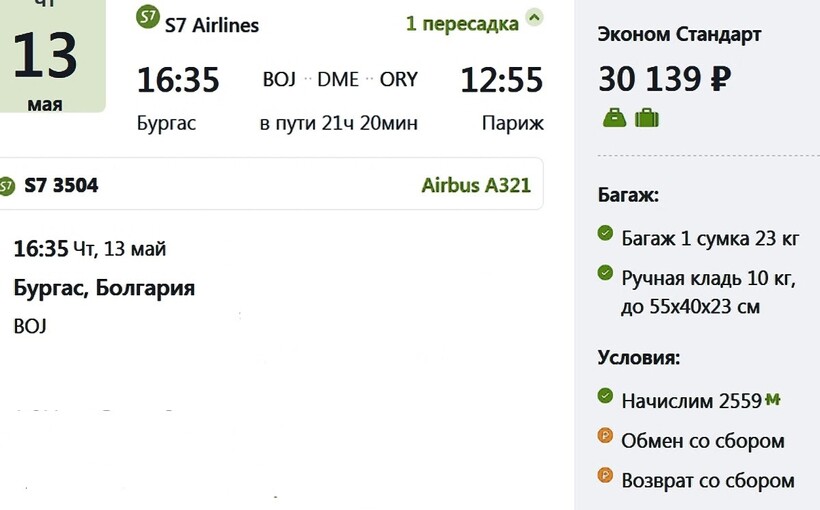 S7 — большая российская компания, самолеты которой круглый год летают через Москву (Домодедово) и приземляются в парижском аэропорту Орли. Стыковка длится 14 часов, и, к сожалению, приходится на вечер и ночь. Плотность расписания зависит от сезона — с ноября по апрель перелеты совершаются 2–3 дня в неделю, а с мая лайнеры вылетают из Бургаса ежедневно. Тарифы для экономкласса следующие: