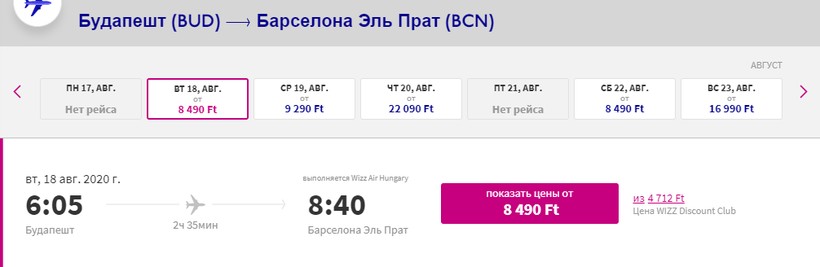 | Wizz Air (W6 2375) Airbus A320 | 06:45 Будапешт (BUD) | 2 ч. 40 мин | 09:25 Барселона (BCN) | 25 октября, 29, 30, 31 марта, 1, 2, 3, 4, 5, 6, 7, 8, 9, 10, 11, 12, 13, 14, 15, 16 апреля, … |