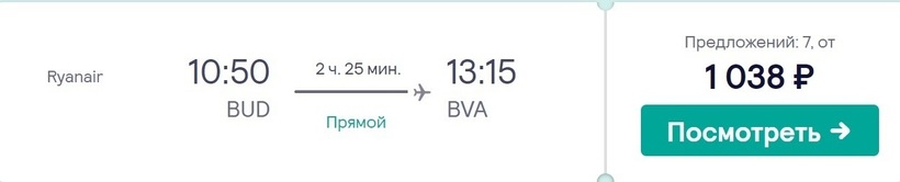 | Ryanair (FR 4229) Boeing 737-800 | 12:00 Будапешт (BUD) | 2 ч. 20 мин | 14:20 Париж (BVA) | сб с 04.04 |