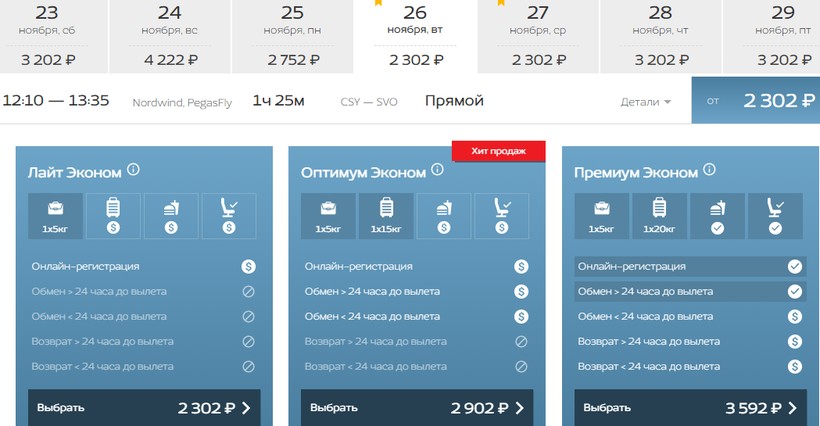 Для перелета по направлению мне обычно достаточно небольшого чемодана, поэтому я у Nordwind выбираю тариф «Оптимум»: путешествие только туда стоит в среднем 3000–4000 ₽, если сразу приобретать и обратный билет — от 5500 ₽. Бизнес-класса у авиакомпании нет.