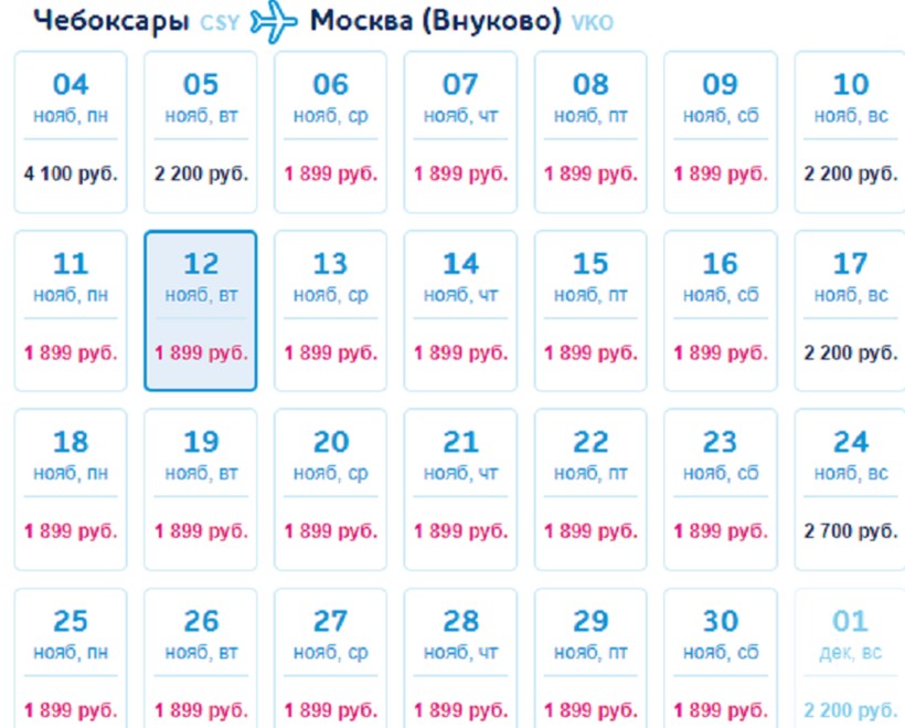 Билеты «туда-обратно» в октябре обойдутся вам всего в 5 498 рублей, а в марте придется заплатить за них не менее 5 981 рубль. В среднем же, долететь до Москвы и вернуться в Чебоксары можно за 5 744 рубля.
