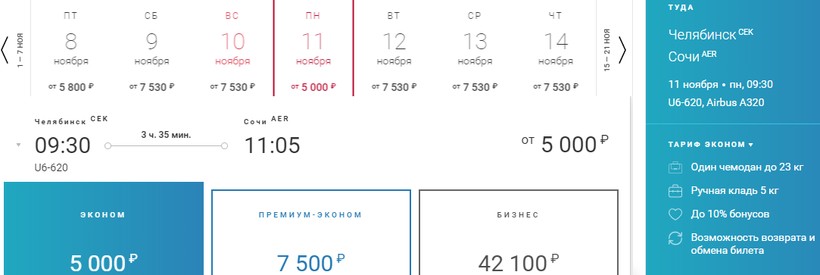 | Уральские авиалинии (U6 620) Airbus А320 | 09:00 Челябинск (CEK) | 3 ч. 50 мин | 10:50 Сочи (AER) | 13 октября |