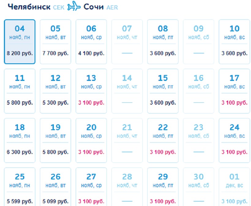 | Уральские авиалинии (U6 620) Airbus А320 | 17:30 Челябинск (CEK) | 3 ч. 50 мин | 19:20 Сочи (AER) | 30 октября |