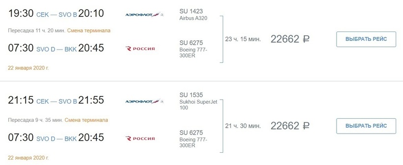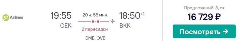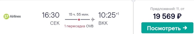 Также авиакомпания S7 предлагает перелет в Бангкок с двумя пересадками. Общее время в пути — 21 час. Авиабилет за 2,5 месяца до путешествия — от 16800 рублей. Первая стыковка в Домодедово (Москва) — 3 ч. Вторая — Толмачёво (Новосибирск) — 4 ч.