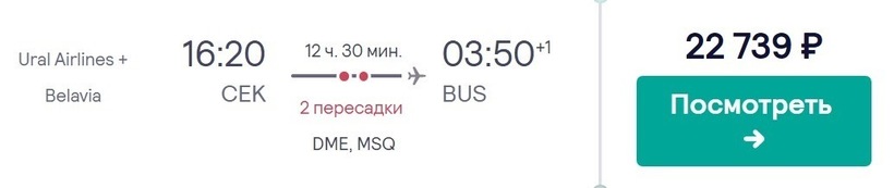 Есть еще более комфортный и быстрый вариант. Его предлагают авиаоператоры «Уральские авиалинии» и «Белавиа». Общее время в пути — 12,5 ч. Стыковки также две — в Москве (3 часа) и столице РБ (2,5 часа). Менять воздушные гавани нигде не нужно. Но этот вариант более дорогостоящий. Билеты только туда — от 22800 рублей (за 1,5 месяца). Но учитывая, что не нужно тратиться на проезд (речь о трансфере между аэропортами), разница в цене получается несущественная.