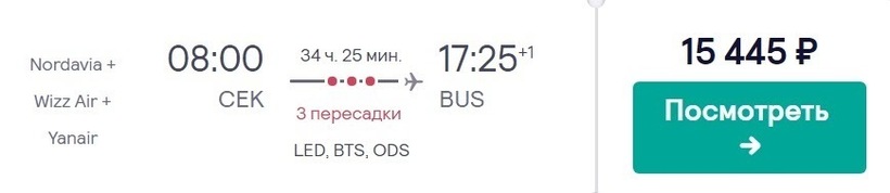 Минимальная стоимость билетов за 1,5 месяца составляет 15500 рублей. Правда, вариант непопулярный по двум причинам: долгое время в пути (1,5 суток) и количество пересадок (три: Питер, Братислава, Одесса). Обратные билеты можете купить за такие же деньги.