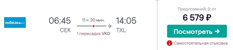 Самый бюджетный вариант авиапутешествия из Челябинска в Берлин предлагает лоукостер «Победа». Билет за 2,5 месяца до поездки — от 6500 рублей. Это в два раза дешевле, чем у «Аэрофлота». Общее время в пути — 11,5 часа.