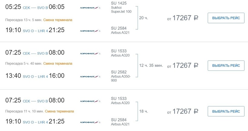 Ведущий российский авиаоператор предлагает не менее десяти вариантов ежедневных полетов по маршруту Челябинск — Москва — Лондон. Время в дороге разное — от 8,5 ч. до суток. Соответственно продолжительность стыковок от 2 до 18,5 ч. Они проходят в самой большой воздушной гавани столицы РФ — Шереметьево. Всегда требуется смена терминала. Имейте в виду, что пересадка между терминалами может занять больше времени, чем вы рассчитываете. Так что, советую изучить схему аэровокзального комплекса заранее, чтобы проще было ориентироваться. Минимальная стоимость билета, установленная авиаоператором — 17200 рублей. Такая цена актуальна как за неделю, так и за полгода до вылета самолетов. В пиковые даты, то есть в период различных популярных праздников, например, новогодних, авиаоператор поднимает стоимость билетов в среднем на 20%.