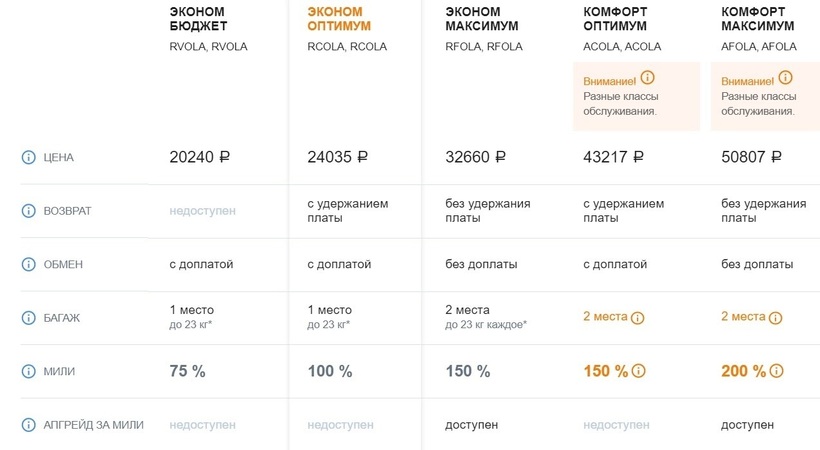 Более продвинутый тариф «Оптимум». По багажу и ручной клади условия остаются те же самые, но билет уже можно вернуть со штрафом. В так называемый комфорт-класс авиакомпания предлагает два тарифа, которые различаются набором опций. Цены стартуют с 43200 рублей (за неделю). Единственное, до Москвы придется лететь в экономе. Так что, по факту получатся разные классы обслуживания на рейсах.