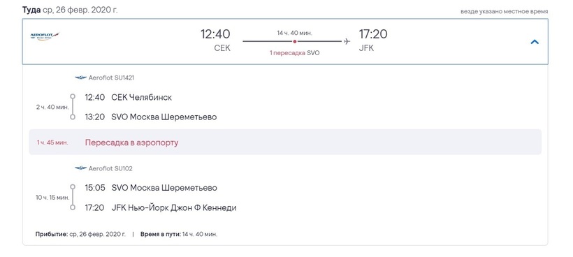 Оптимальным рейсом является перелет «Аэрофлота», продолжительностью 14,5 часов, вместе с 2-х часовой стыковкой в Шереметьево. Это максимально быстрый способ добраться из Челябинска в Нью-Йорк и именно его я выбрала. Вдобавок расписание этого перелета вполне удобное: отправление из Челябинска в обед, а прибытие в Нью-Йорк вечером (не поздно) по местному времени (не забывайте, что летите против часовых поясов). То есть вылетев из Челябинска в обед, по местному времени, вы приземлитесь в этом американском городе вечером того же дня и из-за разницы часовых поясов проведете в пути «пять часов» (понятно, что физически дорога займет 14,5 часов). Разница во времени между городами составляет десять часов. Такой вот парадокс.