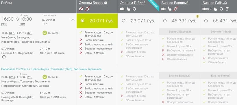 Выбирая между авиапутешествием с S7 и «Аэрофлотом», я отдала предпочтение первому перевозчику. Билеты у S7 дешевле примерно на 35%, чем у «Аэрофлота», плюс именно эта компания выполняет максимально быстрый перелет до Петропавловска-Камчатского.