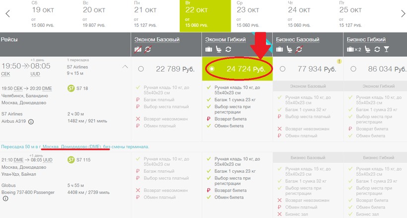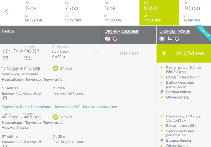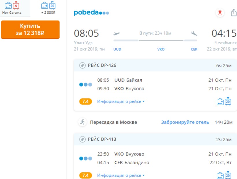 Авиабилеты у S7 Airlines не дешевые, поэтому я искала альтернативные варианты путешествия по маршруту. Преодолеть расстояние между Челябинском и Улан-Удэ можно самолетами компании «Победа» через московскую авиагавань Внуково. Оператор предлагает транзитные рейсы с самостоятельной стыковкой, при которой нужно будет забрать после первого отрезка пути багаж, а затем повторно пройти регистрацию на второй авиарейс. Также если вы опоздаете на пересадку (даже в случае задержки первого лайнера), стоимость полета за второй отрезок маршрута не компенсируется. При минимальном времени стыковки в 3,5 часа полет займет 12,5 ч, но есть варианты и с более длительными пересадками.