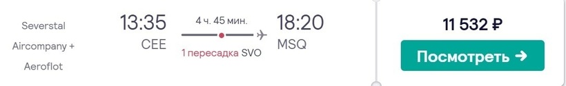 Менее популярный вариант — перелет с а/к «Северсталь» и «Аэрофлот». Дорога до конечного пункта займет около 5 часов. Стыковка будет также в Москве. На нее отводится 2,5 часа. Минимальная стоимость авиабилетов в одну сторону за месяц и более до вылета — 11500 рублей.