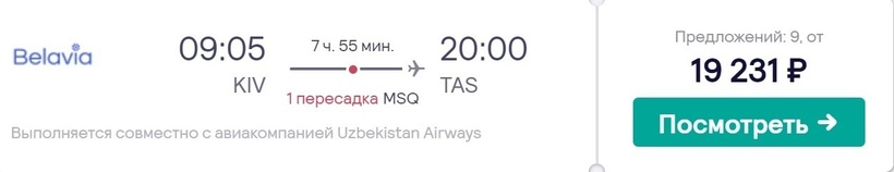 В столицу Узбекистана из Кишинева летает немало авиакомпаний, все рейсы стыковочные — прямого авиасообщения между городами нет. За восемь часов до конечного пункта доставит Belavia (белорусская а/к), Uzbekistan Airways (национальная а/к Узбекистана). Стыковка в Минском аэропорту — 2 часа. Билеты только туда — от 19200 рублей (за 1,5 месяца до полета). А/к предлагают как экономкласс, так и бизнес.