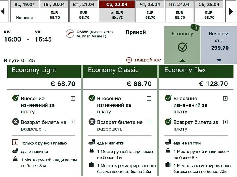 Austrian (OS 716) Airbus А320 | 18:50 Кишинёв (RMO) | 1 ч. 40 мин | 19:30 Вена (VIE) | пт, сб с 03.04 по 27.06 |