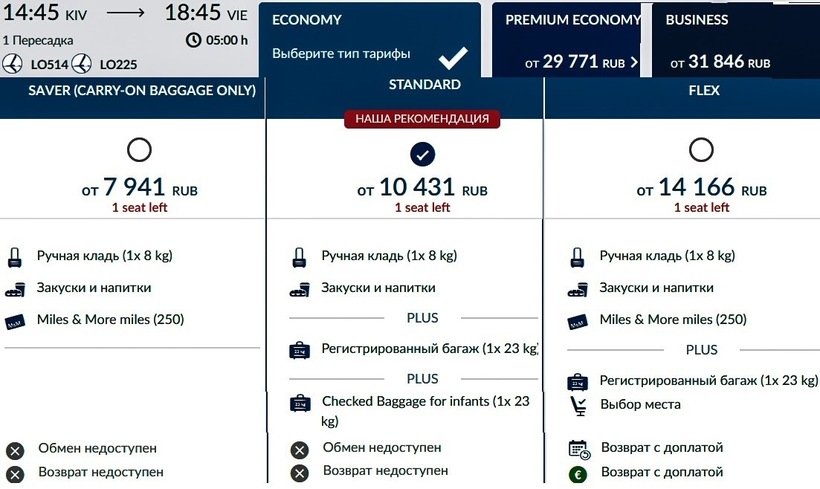 У Austrian Airlines наиболее удобное расписание полетов по направлению — перевозчик ежедневно выполняет по одному-два беспересадочному авиарейсу (утренний и дневной). Билеты у компании могу отнести к недорогим: только туда с багажом будут стоить от 8000 ₽ (90 €), в обе стороны — от 13000 ₽ (150 €). Бизнес-класс — от 26000 ₽ (300 €).