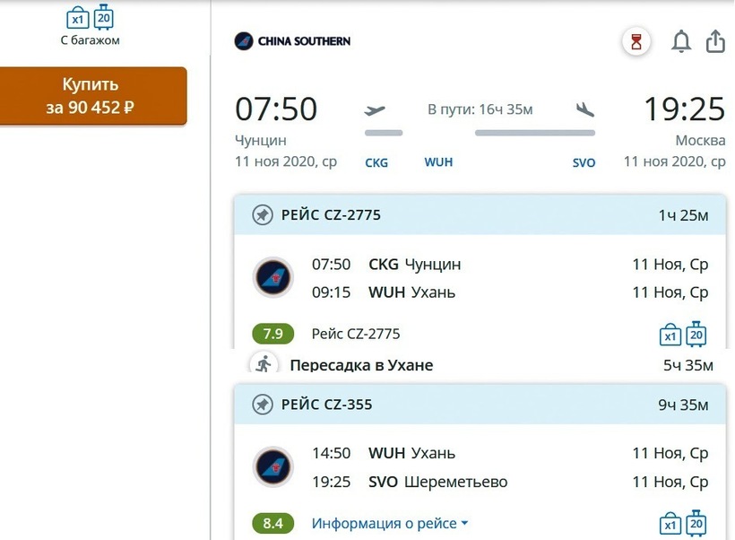 China Southern Airlines в апреле–ноябре совершает ежедневные авиаперелеты по направлению, в осенне-зимний период лайнеры оператора летают во все дни недели, кроме понедельника и четверга. С пересадкой в Пекине, Гуанчжоу или городе Ухань в 1,5–5,5 ч. путешествие занимает 12,5–16,5 ч. Не могу рекомендовать преодолевать путь с китайским перевозчиком в период с ноября по конец марта, потому что в эти месяцы перелет с данной компанией не из дешевых: туда стоит (с багажом до 20 кг) от 90500 ₽, в обе стороны — от 137500 ₽. Выгоднее путешествовать с оператором в апреле–октябре, когда в одну сторону авиабилет обойдется всего от 41500 ₽, туда-обратно — от 70000 ₽. Тариф с ручной кладью у «Китайских Южных авиалиний» недоступен. Бизнес-класс — от 124000 ₽.