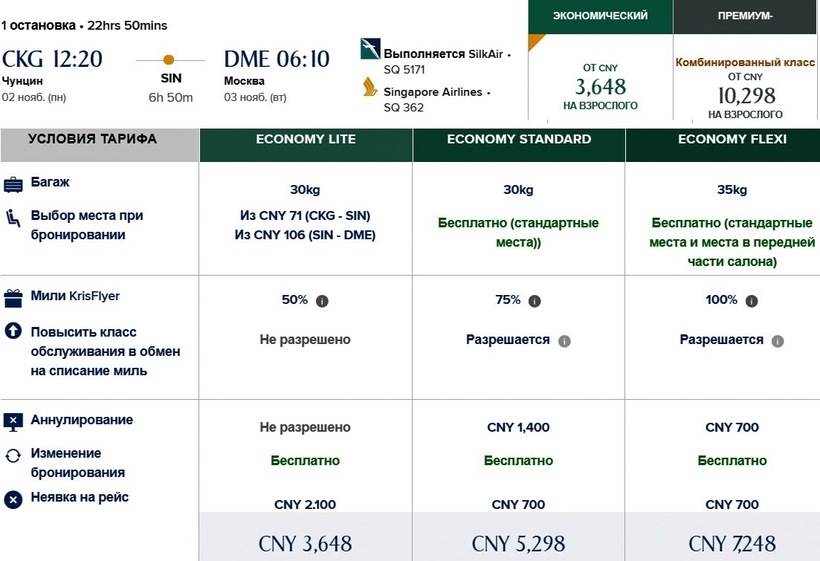 С SilkAir и Singapore Airlines можно улететь по маршруту ежедневно, кроме среды. Любителям непродолжительных путешествий я рекомендую выбирать полеты по понедельникам, пятницам и воскресеньям, которые с семичасовой стыковкой в Сингапуре занимают 22,5 ч. В остальные дни недели пересадка длится 18–24,5 ч., весь перелет — 34–41 ч. Второй вариант подойдет тем, кто хочет посмотреть достопримечательности Сингапура. Например, советую отправиться в ботанический сад «Облачный лес», погулять по набережной Клар-Ки, а также взглянуть на город со смотровой площадки «Скайпарк». Главное преимущество данных операторов — недорогие авиабилеты: только туда стоят от 37000 ₽ (3648 юаней), если забронировать места и на обратный путь, это обойдется всего от 62000 ₽ (6110 CNY). Минимальные цены у SilkAir и Singapore Airlines включают провоз багажа, поэтому сэкономить, если лететь с ручной кладью, не получится. Бизнес-класс — от 199000 ₽.