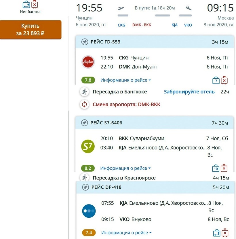 Тем, кто предпочитает путешествовать без багажа (напомню, вышеописанные операторы тарифы с ручной кладью не предлагают), могу порекомендовать длительные перелеты с самостоятельными стыковками. Например, преодолеть путь в одну сторону можно всего за 24000 ₽ с компаниями Thai AirAsia, S7 Airlines и «Победа». Полет длится 42,5 ч., включая пересадки в Бангкоке в 22 ч. и Красноярске в 4 ч. Во время продолжительной стыковки в столице Таиланда советую, например, отправиться в храм Лежащего Будды, осмотреть Большой Королевский дворец, прогуляться по улице Каосан и заглянуть на рынок Чатучак.