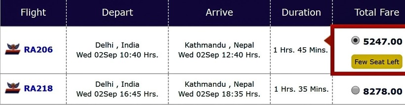 Самолеты Nepal Airlines с ноября по апрель летают по одному разу в день (вылет утренний), в весенне-летнее время оператор выполняет по два ежедневных авиарейса. Билеты у компании недорогие: в одну сторону можно купить за 5000 ₽ (5247 индийских рупий), туда-обратно обойдутся от 11000 ₽ (11705 INR). Бизнес-класс — от 20000 ₽ (21135 INR). В стоимость полета в экономклассе включен провоз чемодана багажа весом до 25 кг.