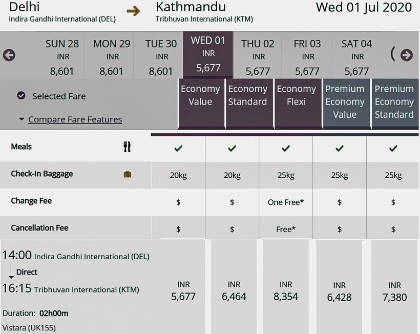 Vistara осуществляет по одному ежедневному дневному перелету. По стоимости авиабилетов этот оператор немного уступает вышеописанному непальскому перевозчику: путешествие только туда стоит от 5500 ₽ (5677 INR), туда-обратно — от 11200 ₽ (11900 INR). Полет в бизнес-классе — от 21000 ₽. У индийской компании в минимальный тариф также включен багаж, но его норма составляет всего 20 кг.