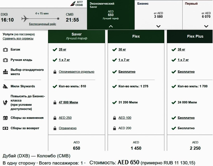 Emirates (EK 652) Boeing 777-300ER | 09:40 Дубай (DXB) | 7 ч. 15 мин | 18:25 Коломбо (CMB) | ежедневно с 26.10 по 25.03 |