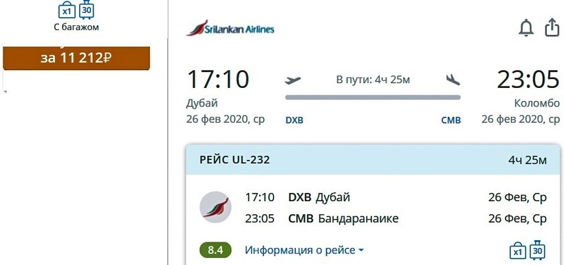 Srilankan Airlines (UL 226) Airbus А330-200 | 23:10 Дубай (DXB) | 4 ч. 20 мин | 05:00 Коломбо (CMB) | 29, 30, 31 октября, 1, 2, 6, 7, 8, 9, 11, 13, 14, 15, 20, 21, 22, 23, 27, 28, 29 ноября, … |