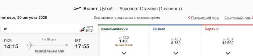 | Emirates (EK 121) Boeing 777-200LR | 14:20 Дубай (DXB) | 5 ч. 10 мин | 18:30 Стамбул (IST) | 3 ноября |