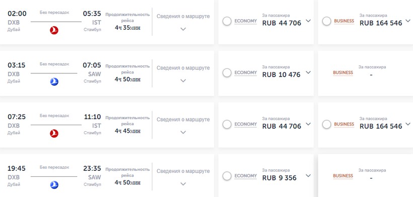| Turkish Airlines (TK 759) Airbus А330-300 | 09:30 Дубай (DXB) | 5 ч. 15 мин | 13:45 Стамбул (IST) | 26, 27, 28, 29, 30, 31 октября, 1, 2, 3, 4, 5, 6, 7, 8, 9, 10, 11, 12, 13, 14 ноября, … |