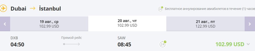 | Flydubai (FZ 753) Boeing 737 | 17:30 Дубай (DXB) | 4 ч. 45 мин | 21:15 Стамбул (SAW) | ежедневно по 25.10 |