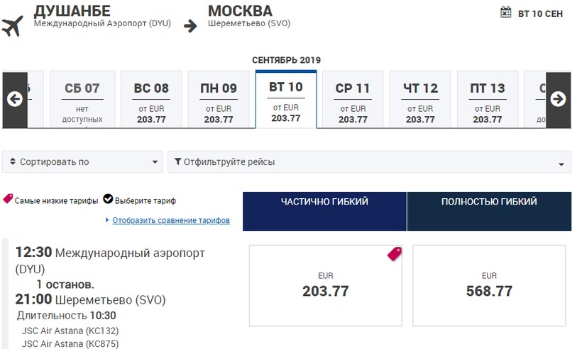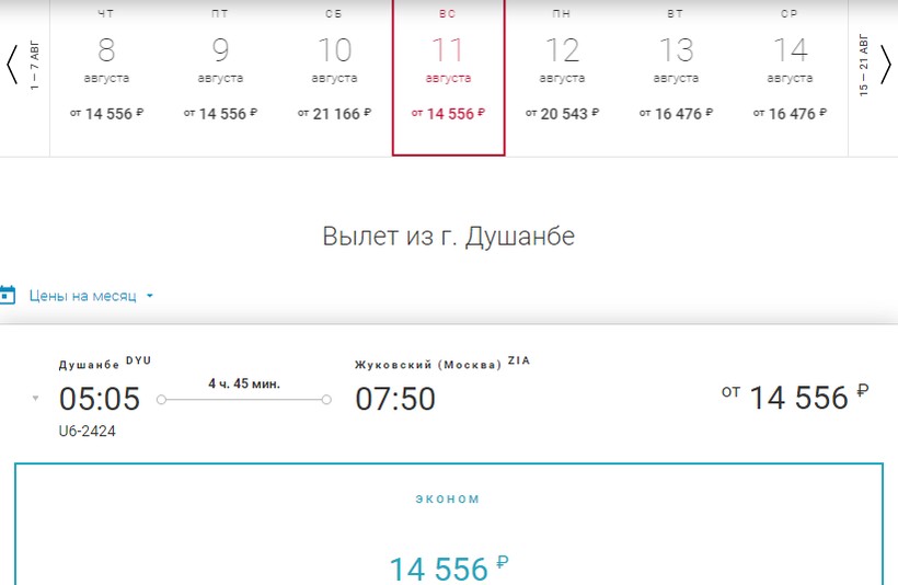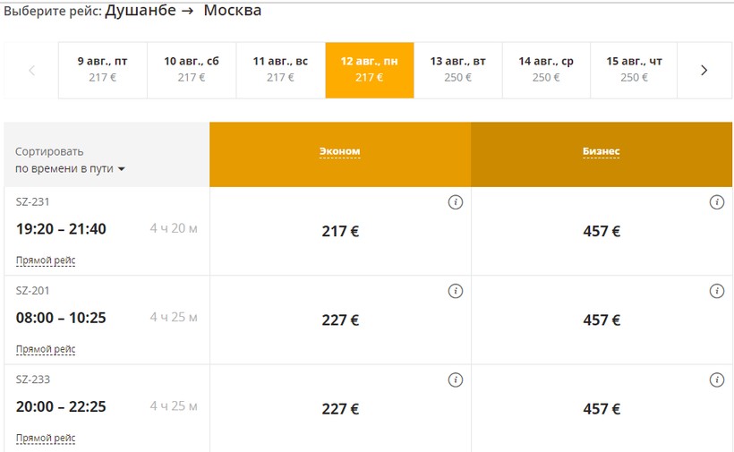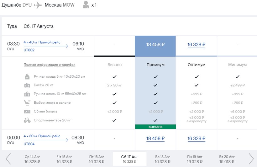 Этот российский авиаперевозчик выполняет ежедневно по маршруту по два прямых рейса — ночной и рано утром. Что касается стоимости, для авиаперелета из Душанбе в Москву компания предлагает билеты в экономклассе по двум тарифам:
