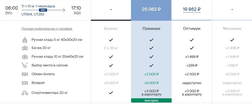 Стоимость перелета в одну сторону составляет минимум 19800 рублей (за неделю и более). Для этого маршрута доступно только два тарифа экономкласса — «Оптимум» и «Премиум». Авиатарифы отличаются не только ценами, но и набором опций. Транзитный перелет доступен каждый день. Небольшую скидку (в пару тысяч рублей) получите, оформив сразу проездные документы туда-обратно.