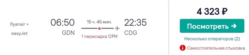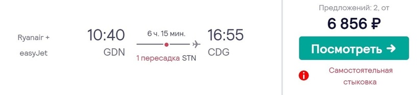 Вариант перелета с пересадками востребованный, потому что прямые рейсы выполняются только два раза в неделю, да и время вылета может не всем подходить. Рассматривать его как более бюджетный нельзя — билеты минимум в 2,5–10 раз дороже. Один из наиболее дешевых транзитных перелетов до столицы Франции предлагают Ryanair и easyJet. Авиабилеты за неделю можно приобрести за 4300 рублей.
