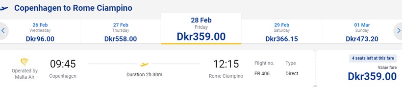 Во время своих поездок я часто летаю с лоукостерами, потому что у них самые выгодные предложения. Ирландский бюджетный перевозчик летает до Рима транзитом или через Копенгаген, или через Лондон. Я предпочла первый вариант, так как он более дешевый. Весь перелет займет 5 часов 40 минут. Лайнер до столицы Дании летает один раз в сутки рано утром.