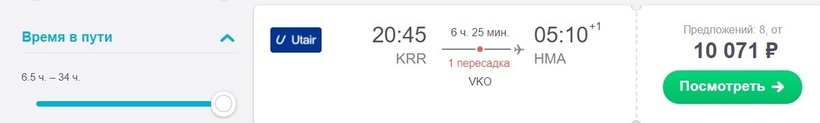 Utair со стыковкой час во Внуково. Общее время в пути — 6 ч. 30 мин., цена — 10000 рублей (если купить за три недели). Вылет из Краснодара.