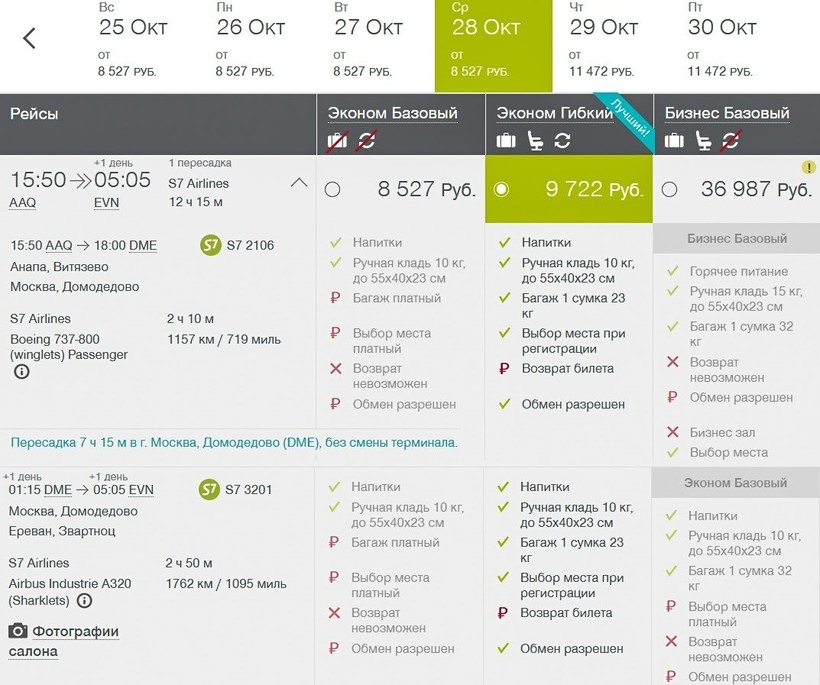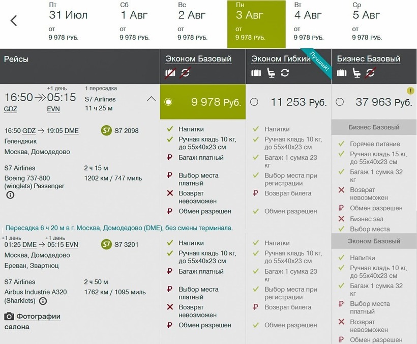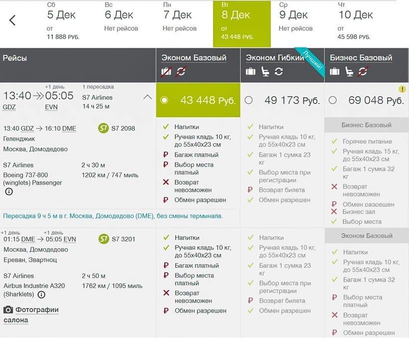 Компания S7 Airlines превосходит вышеописанного российского перевозчика в расписании рейсов хотя бы потому, что S7 осуществляет круглогодичные авиаперелеты. В весенне-летнее время лайнеры летают каждый день по одному разу (вылет вечерний), с конца октября по апрель полеты совершаются только по вторникам, четвергам и субботам. Включая стыковку в Домодедово в 6,5–9 ч., авиапутешествие занимает 11,5–14,5 ч. У данного оператора есть существенное преимущество перед предыдущей российской авиакомпанией по ценам: в весенне-летний период билет в одну сторону с багажом обойдется от 11500 ₽, если забронировать полет сразу и на обратную дорогу, это будет стоить от 21500 ₽. Только с ручной кладью путешествие дешевле на 1500 ₽. Долететь с S7 в бизнес-классе можно только до российской столицы, на втором отрезке пути (Москва — Ереван) доступен лишь класс эконом. Этот вариант авиаперелета по маршруту стоит от 38000 ₽.