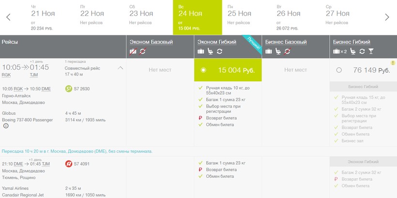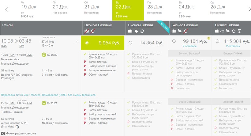 Преодолеть маршрут с этими операторами можно по понедельникам и пятницам. Я иногда стараюсь подстраивать даты своего путешествия под график этих перевозчиков, во-первых, потому что с пересадкой в 4 ч. в Новосибирске весь полет займет всего 7,5 часа (максимально быстрый вариант перелета). Во-вторых, авиабилеты у компаний самые дешевые: только туда стоят от 9000 ₽, в обе стороны — от 17500 ₽. Цены действуют на ближайшие даты и за два месяца до вылета. Бизнес-класс операторы не предлагают.
