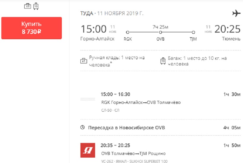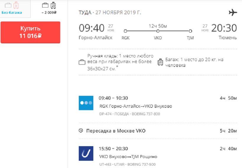 Авиарейсы с самостоятельной стыковкой. Это значит, что после первого отрезка пути нужно будет забрать багаж, а затем пройти регистрацию на рейс Москва — Тюмень. В случае опоздания на второй рейс, стоимость неиспользованного билета не компенсируется.