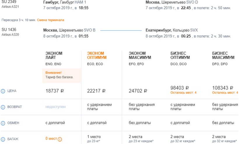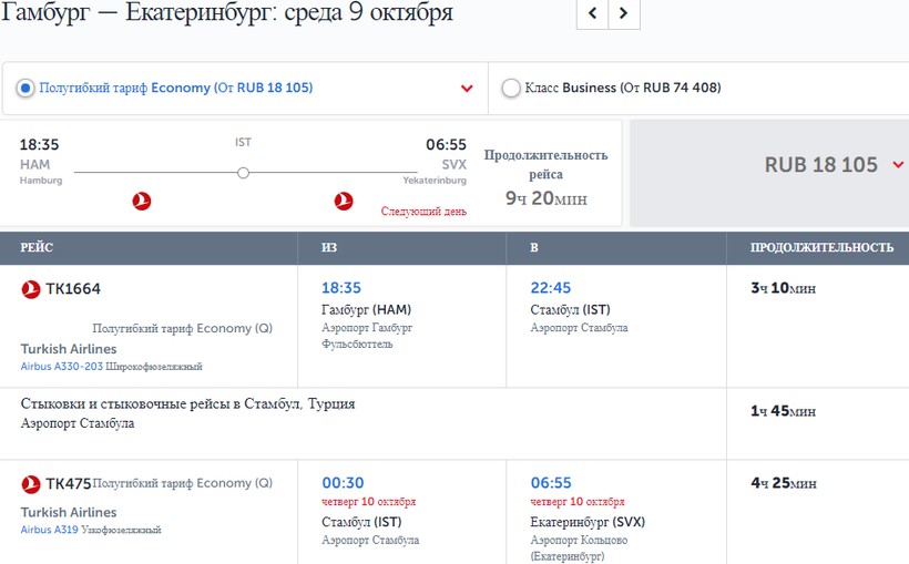 Прямые авиарейсы из немецкого Гамбурга в российский Екатеринбург не выполняются, поэтому преодолевать маршрут придется транзитом. Стыковочные перелеты отличаются местом и продолжительностью пересадки, стоимостью и перевозчиками, их осуществляющими. Самые удобные транзитные путешествия предлагают компании «Аэрофлот» и Turkish Airlines. Подробнее о каждой расскажу дальше.