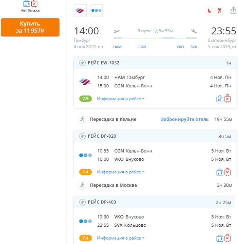 Описанные выше варианты стыковочных перелетов по маршруту не единственные возможные, но их я считаю самыми удобными. А тем, кто все же хочет сэкономить, несмотря на некоторые неудобства, могу рекомендовать дешевый полет с лоукостерами (только с ручной кладью) с двумя пересадками — рейсы Eurowings и «Победы» через Кельн и московский Внуково. Общая продолжительность авиапутешествия составит почти 30 ч, но обойдется оно всего в 12000 ₽ (в одну сторону).