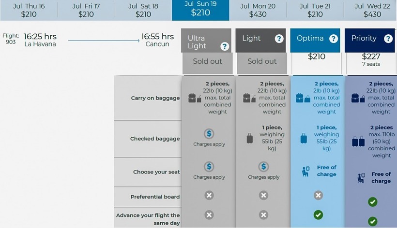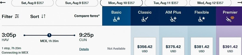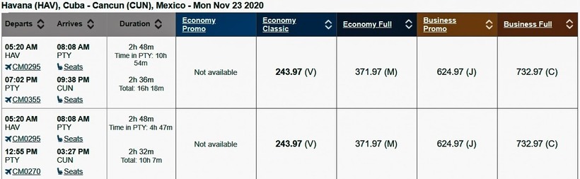 Авиасообщение между столицей Кубы и популярным мексиканским курортом могу назвать довольно развитым — кроме того, что преодолеть путь можно транзитом, круглогодично по направлению также выполняются прямые рейсы мексиканской бюджетной авиакомпанией Interjet. Расписание полетов у данного оператора удобное: с апреля по ноябрь каждый день совершается по одному-два беспересадочных авиарейса, в осенне-зимний период самолеты лоукостера летают во все дни недели, кроме понедельника и среды. На ближайшие даты авиабилеты у Interjet не самые дешевые: только туда с багажом стоят от 14000–15000 ₽ (200–210 $), в обе стороны полет обойдется от 28500 ₽ (404 $). Бизнес-класс лоукостер не предлагает.