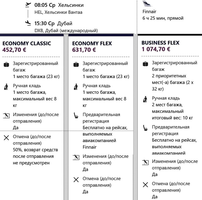 | Finnair (AY 1963) Airbus A350-900 | 14:10 Хельсинки (HEL) | 6 ч. 40 мин | 22:50 Дубай (DXB) | 26, 27, 28, 29, 31 октября, 1, 2, 3, 27, 28, 29, 30 ноября, 1, 2, 3, 4, 5, 6, 7, 8 декабря, … |